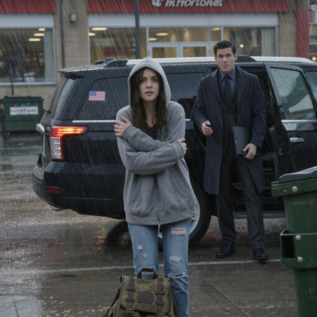 I walked until my shoes soaked through, slept on park benches, learned which shelters turned teens away after nine. Weeks later, I was behind a Tim Hortons at dawn, digging through trash for anything still wrapped, when a black SUV pulled up.