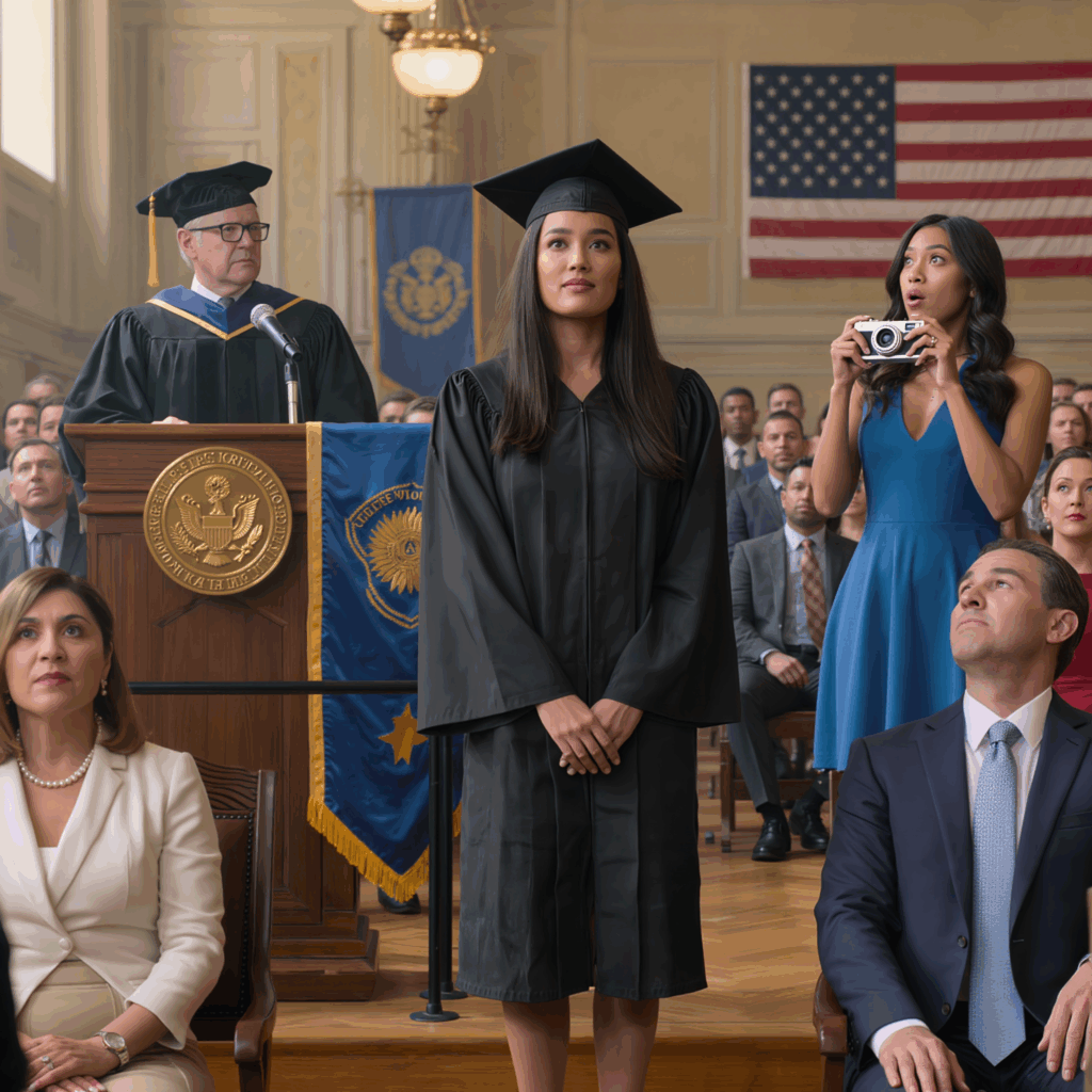 The ceremony took place on a Friday morning in early May, the kind of day that feels borrowed from spring—bright sky, soft breeze, everything pretending to be perfect. I arrived early, clutching the invitation so tight the edges bent. The hall was enormous, draped in blue and gold banners, the air filled with the low hum of conversation. I found my seat among the other recipients, all of us wearing nervous smiles and polished shoes that pinched just a little.